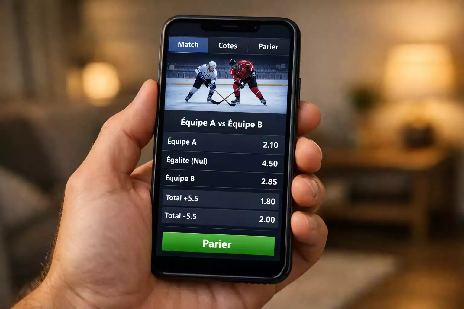 Interface de site de paris avec match de hockey en vedette
